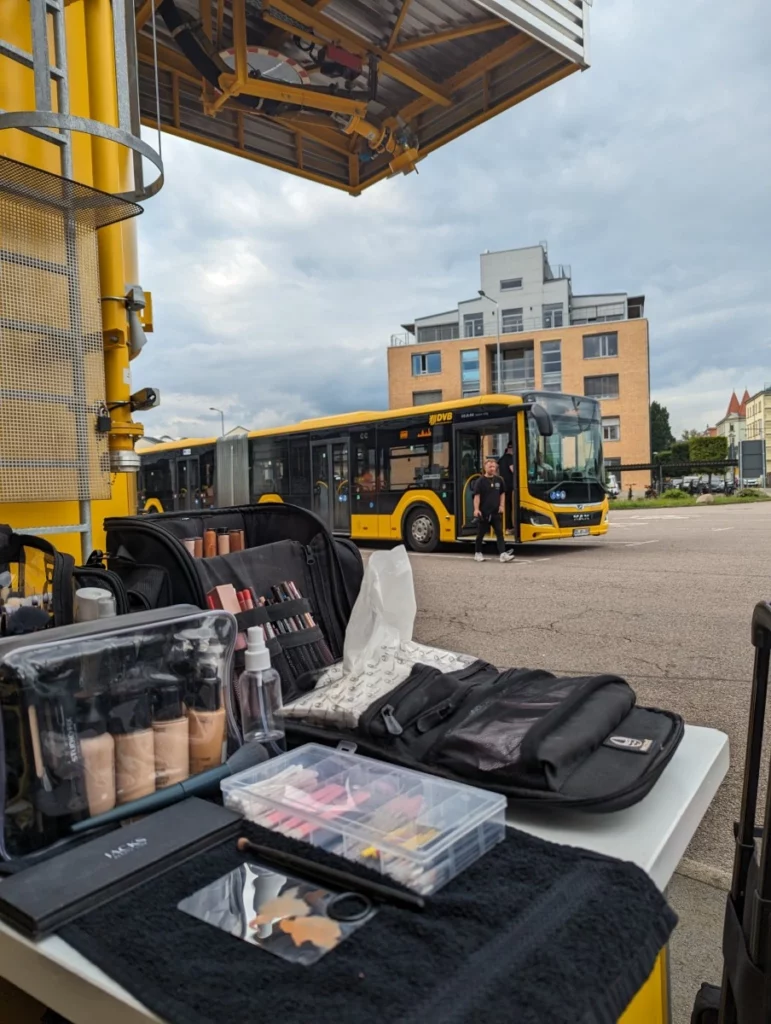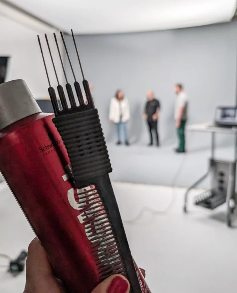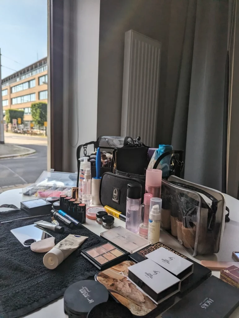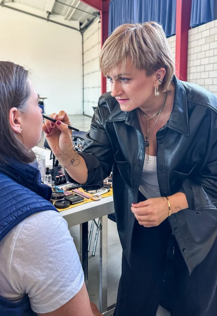 Die Visagistin achtet auf Haare, Kleidung und Details – und hält den Look während des Drehs konstant perfekt.